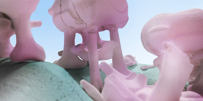 The objects with architectural features inhabit the terrain. As they collapse, an organic and animated landscape emerges.