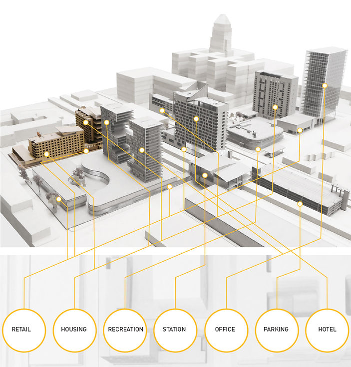 The whole studio, 6 groups , collaborate on developing an overall plan for New Center area. At the heart of the project is a small Amtrak station. The availability of land around it is ideal for Transit-oriented Development (TOD). The TOD is lively and a dense node with housing, retail/office, entertainment and public space tapering off to clean/light industry, small/lean startups and gardens at the edge.